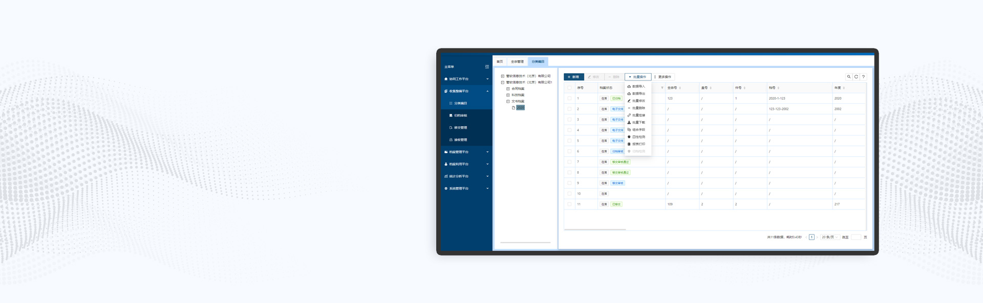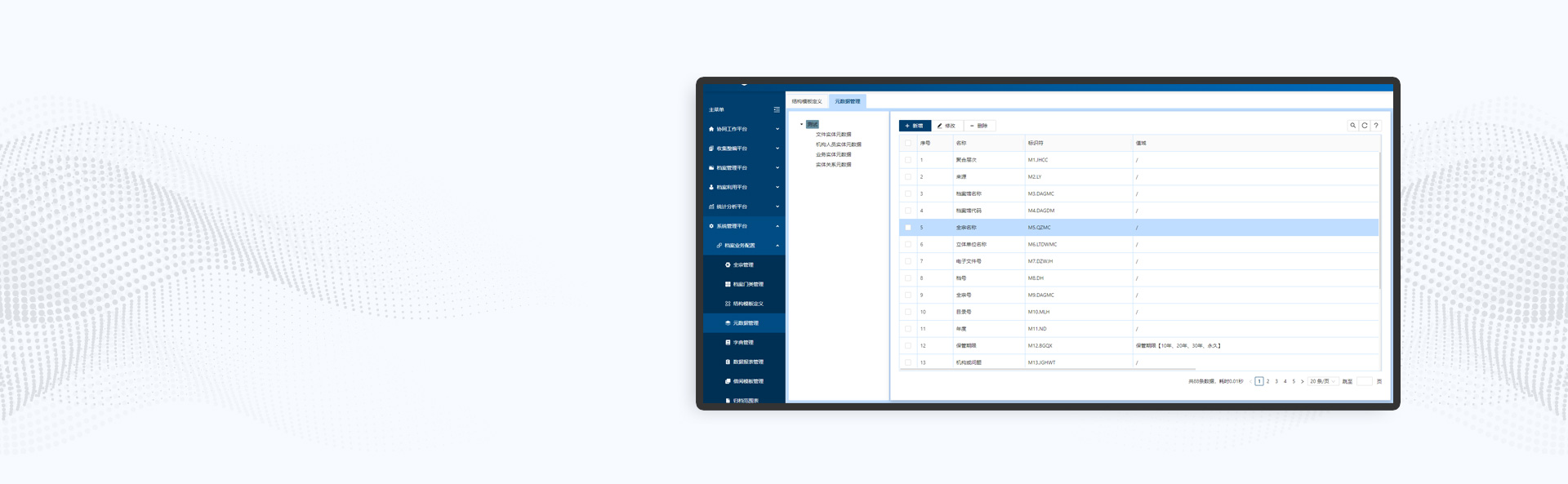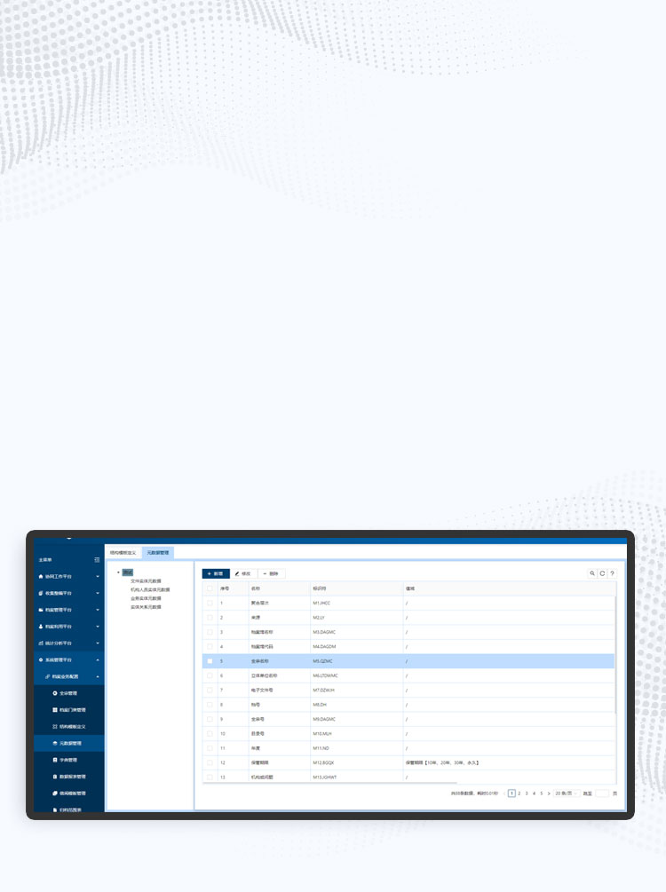 全宗管理、檔案門類管理、結(jié)構(gòu)模板定義、元數(shù)據(jù)管理、字典管理、數(shù)據(jù)報表管理、借閱模板管理、索引庫管理、分類庫管理、發(fā)布管理