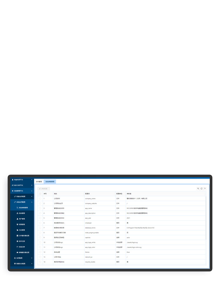 系統(tǒng)參數(shù)管理、機構(gòu)管理、用戶管理、權(quán)限管理、日志管理、文件服務設(shè)置、軟件注冊、數(shù)據(jù)遷移